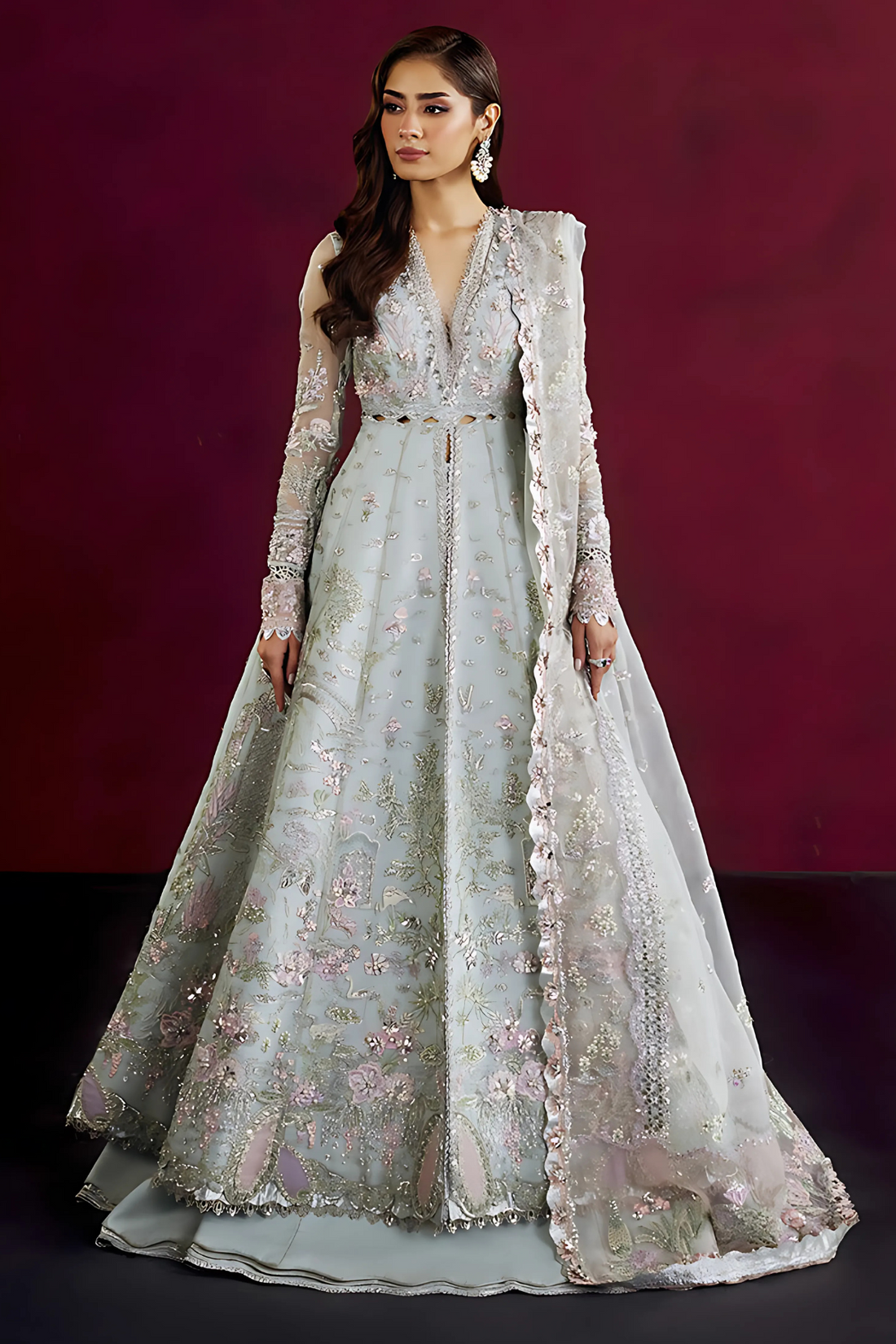 An ethereal grey ensemble with delicate silver embellishments. Perfectly crafted to exude sophistication and refined charm for grand occasions.