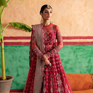 Embrace timeless elegance with this magenta masterpiece, adorned with golden embroidery and paired with a contrasting teal dupatta. A royal choice for weddings and festive soirées.