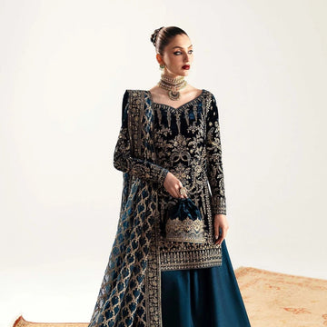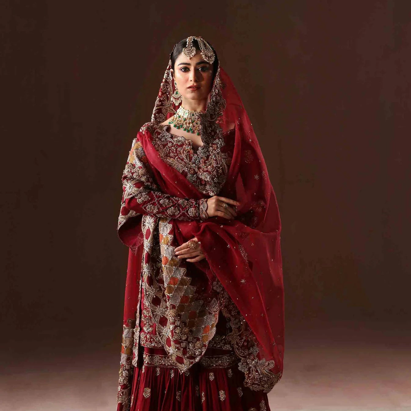 Embrace timeless elegance with this magenta masterpiece, adorned with golden embroidery and paired with a contrasting teal dupatta. A royal choice for weddings and festive soirées.