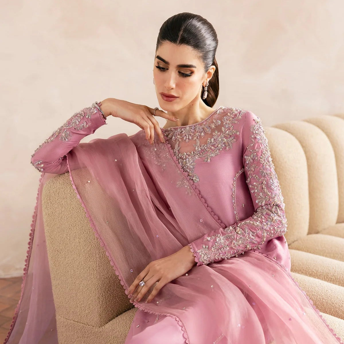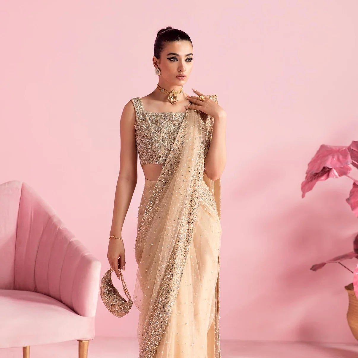 Soft peach tones adorned with intricate embellishments. This ensemble radiates luxury and femininity, making it an unforgettable festive attire.