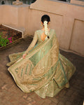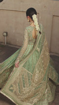 Embodying elegance, Edrina is a stunning grayish blue ensemble that reflects early Islamic art compositions from Mughal landmarks. The shirt showcases a bedecked cartouche that frames embellished rose, iris and narcissus motifs wrought using naqshi, kundan and resham. This ensemble is paired with an organza dupatta. The sophisticated silhouette and fine craftsmanship make Edrina a beloved choice, time and again.
