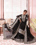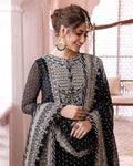 Discover the secrets of the “Chandni Collection”, as Sajal Aly showcases the sleek straight shirt and heavily embroidered lehenga outfit. This design is embellished with silver zari and cupped sequins, creating a poetic simile of a starlit noir sky. The neckline is embroidered with intricate detail, giving it a traditional touch. The lehenga has gorgeous borders running along hem paying homage to our cultural heritage. It features a lushly endowed dupatta framed by embroidered borders which enhances this royal look.