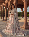 Description: Fashioned in a dainty khaadi net fabric, Naisha is an epitome of classic elegance. This set features a tessellated jaal of hand-cut sequins, dabka and naqshi layered with contrasting red blooming florals etched in resham and zardozi. Its richly detailed jaal is entwined with linear design accents wrought with cut dana and tilla that run through the length of the shirt. Paired with a gorgeously ornamented farshi gharara, gold dupatta adorned with an encrusted border all over and a contrasting red chaddar, Naisha is timeless in appeal.