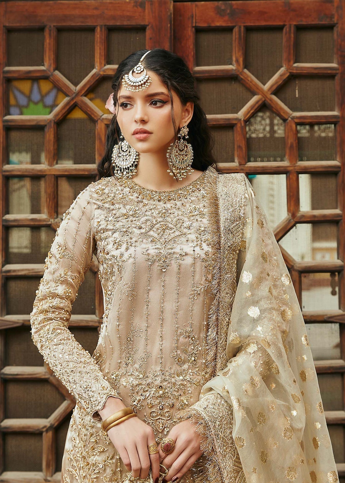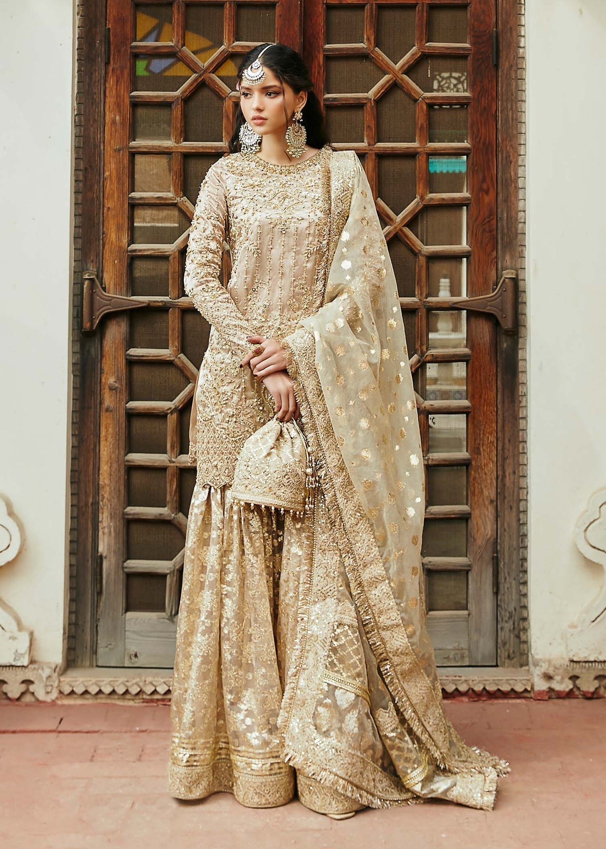Indulge in the epitome of opulence with this resplendent gold ensemble, a lavish celebration of traditional craftsmanship and modern sophistication. The outfit features a meticulously crafted shirt, garara, and dupatta, each element contributing to the overall grandeur of the attire. The shirt, crafted from pure Gold tissue, is a canvas of luxury with intricate hand embellishments and embroidery adorning the front and sleeves. The meticulous detailing on the shirt not only showcases expert craftsmanship but also elevates the piece to a level of unmatched extravagance. The pure tissue fabric lends a regal touch, ensuring that every movement is accompanied by a shimmering play of light. The gharara, a symbol of timeless elegance, is fashioned from the badla fabric and pure tissue fabric and mirrors the opulence of the shirt.