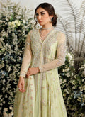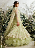 The sheer, kiwi green net kalidaar is layered over a shimmering strappy bustier, also heavily hand worked.