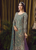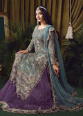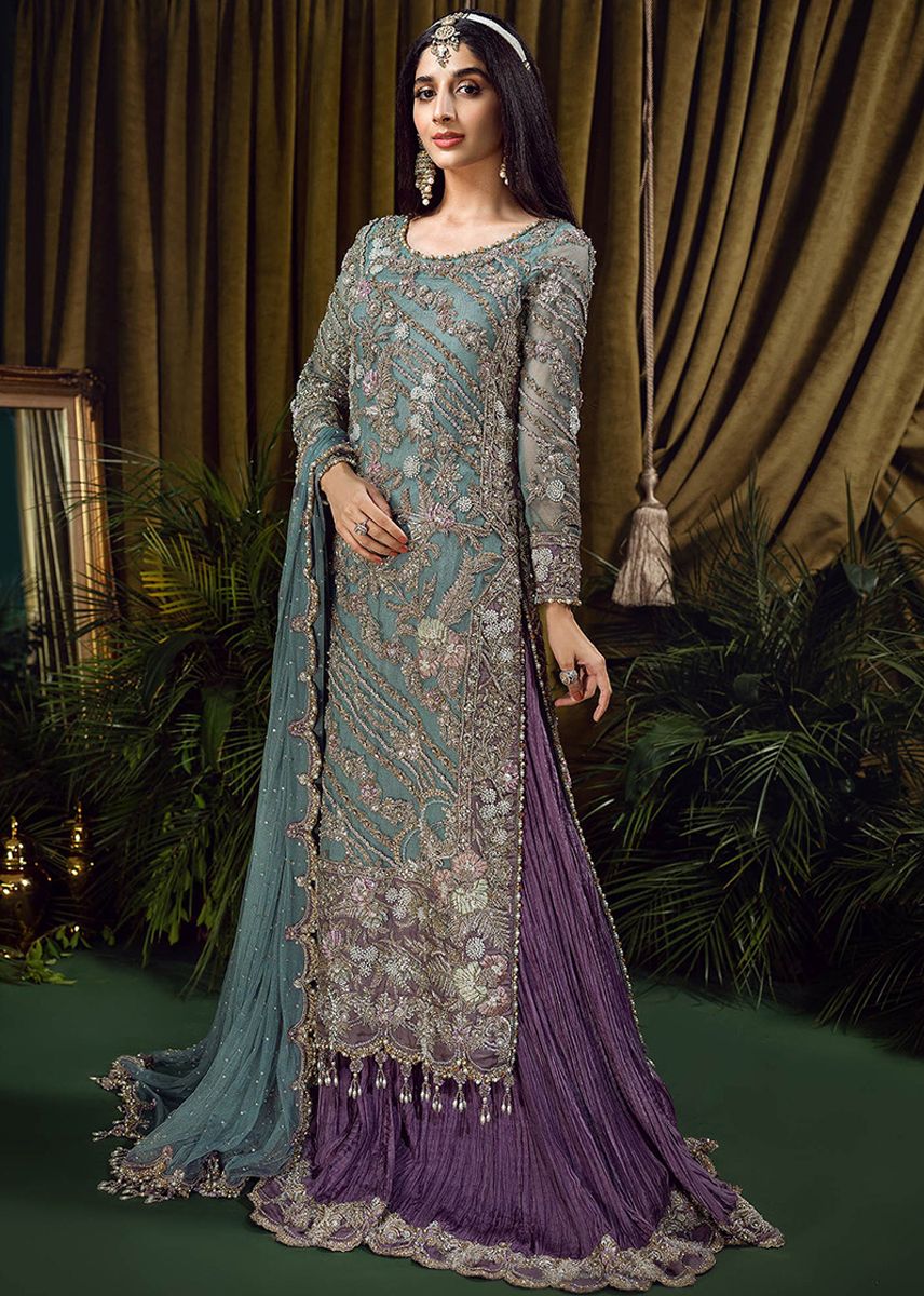 An elaborate and richly adorned three piece outfit. The shirt and dupatta are made out of pure net while the sharara is made out of crushed silk to give it a complete look. The shirt is fully embellishment from front and back while both the dupatta and sharara are laden with an intricate scallop border.