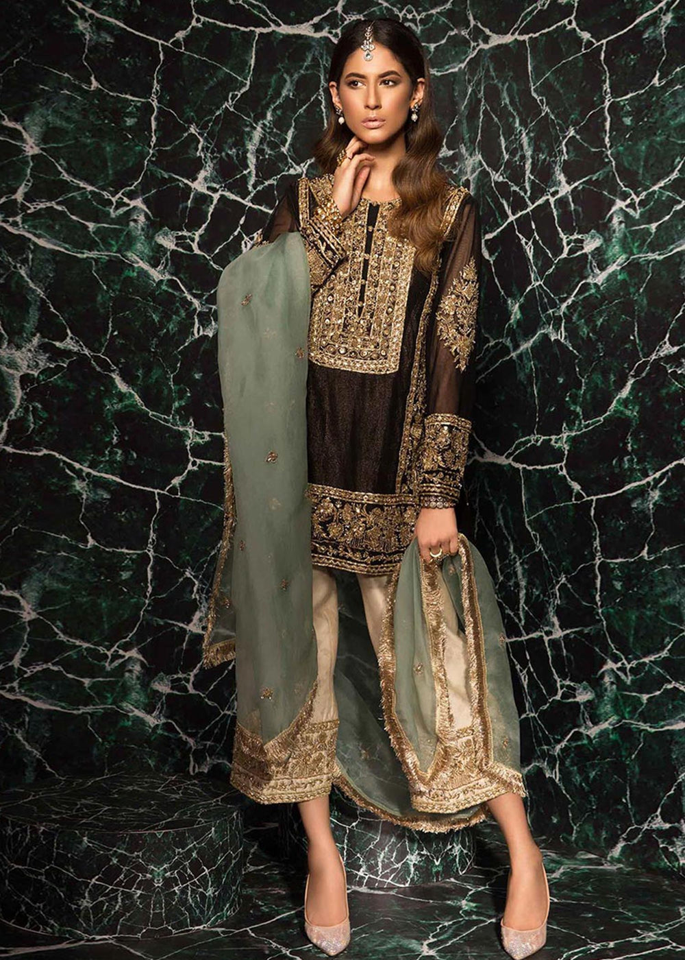 Indulge in the epitome of effortless elegance with the Gilded Onyx ensemble. Designed to empower the modern woman, this outfit combines fluid silhouettes with intricate handwork. The meticulous attention to detail, from the delicate embellishments to the luxurious fabrics, ensures a breathtaking look that is both timeless and contemporary.