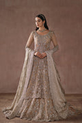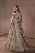 A majestic allure via this exquisite design. A champagne gold base is entirely embellished in silver with delicate hints of mint and soft pink resham. Beautiful floral imagery is depicted throughout this design. The silver dupatta is a mix of embroidery and pure silk tissue with ornate zardozi borders and an all over 'jaal'. Sheer net sleeves create an illusion that dainty sparkly work covers the skin.