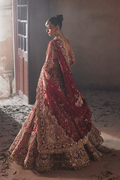 Presenting IRIS, a stunning red gown flared exquisitely with a lehenga. This high-couture bridal piece is elevated by a dupatta adorned with subtle hints of corals. The outfit is a testament to meticulous craftsmanship, boasting hours of intricate handwork. The precious mukesh technique adds an extra layer of elegance, making this piece a true standout. Perfect for the bride who wants to make a grand statement on her big day!