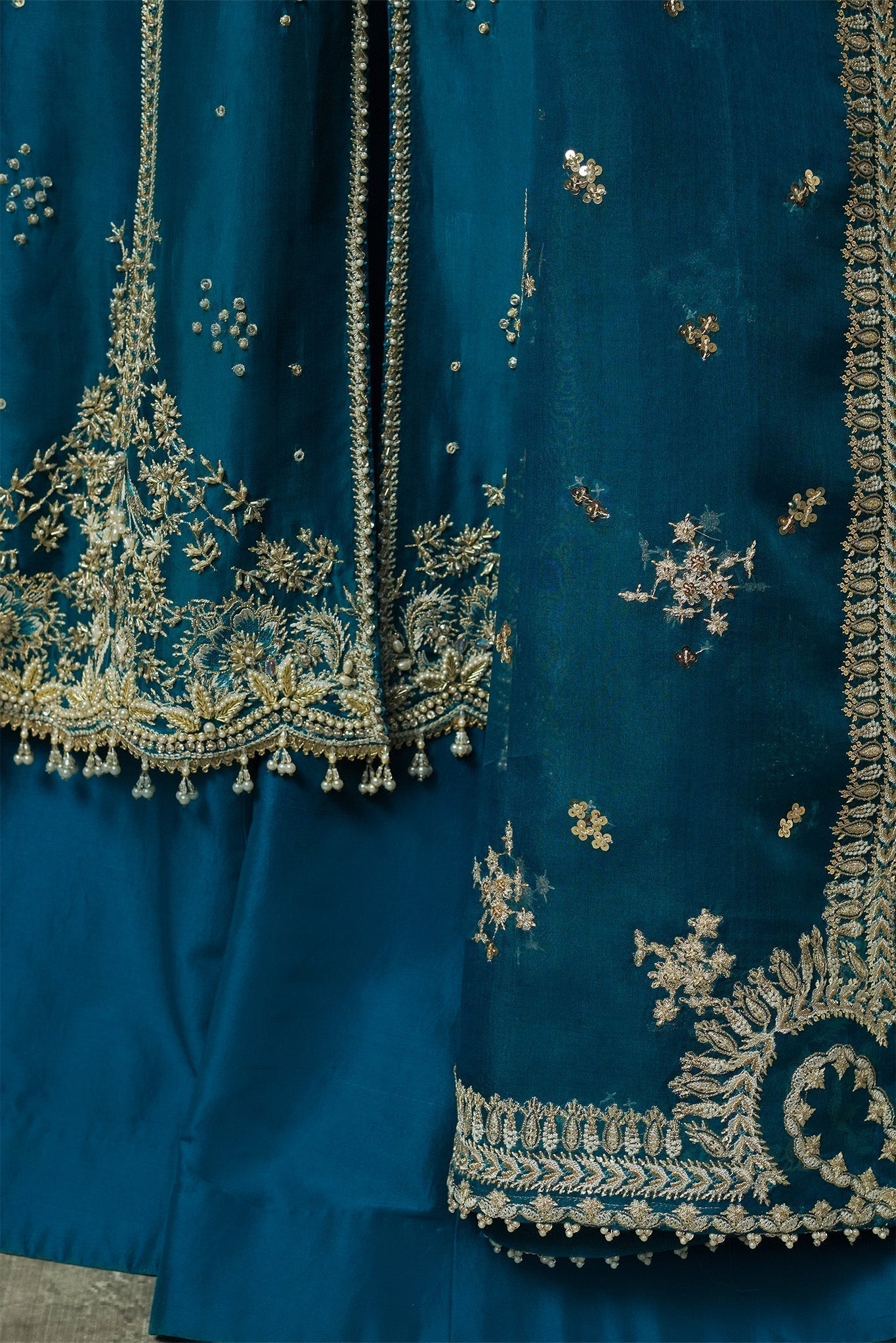 Presenting the teal blue dress with its stunning, elegant pearl and zardozi work truly exudes sophistication. The raw silk sharara adds a touch of luxury, and the delicate dupatta brings a graceful finish to the outfit. This outfit is a perfect fusion of traditional beauty and modern style.